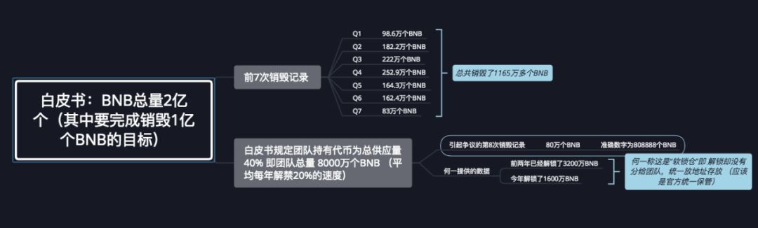 如图所示,团队代币的解锁在2年前币安上线时候解锁1600万。去年解锁1600万。今年7月20日再解锁1600万。币安的解释是,无论它从这4800万枚的筹码里面销毁或者从日常钱包里面进行销毁bnb对市场的影响是一样的。也不算更改白皮书。无非就是左兜右兜的问题。