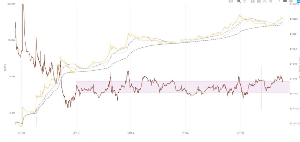 NVT=比特币价格/90天平均链上交易活跃度,目前该指数所处位置如图: