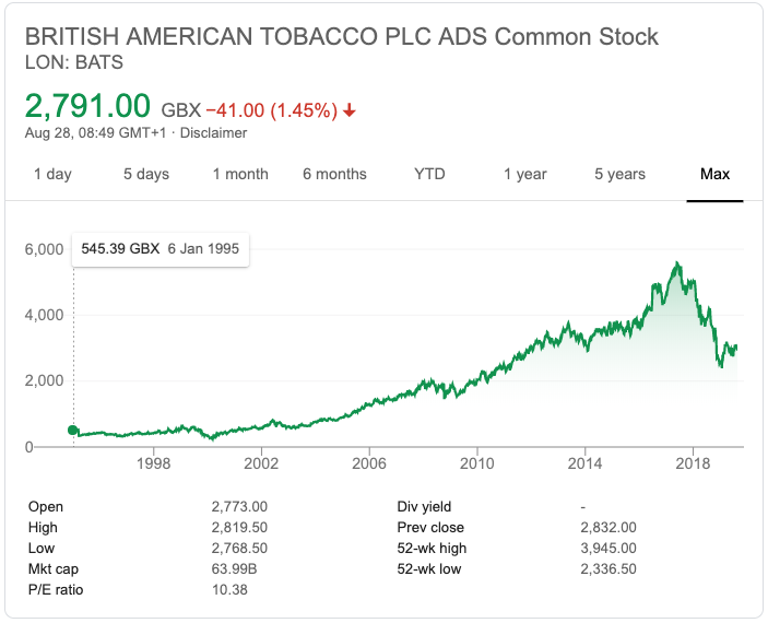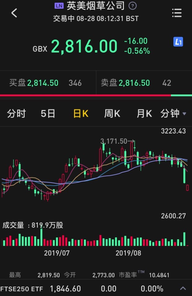 下图是英美烟草的股价。请注意GBX是便士。所以100GBX等于一个英镑(GBP)。