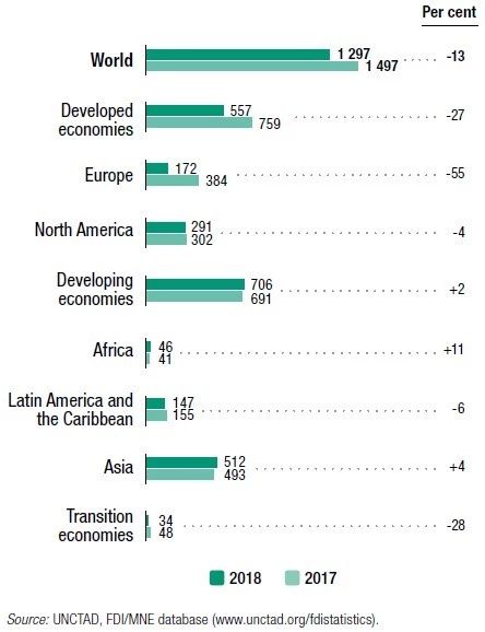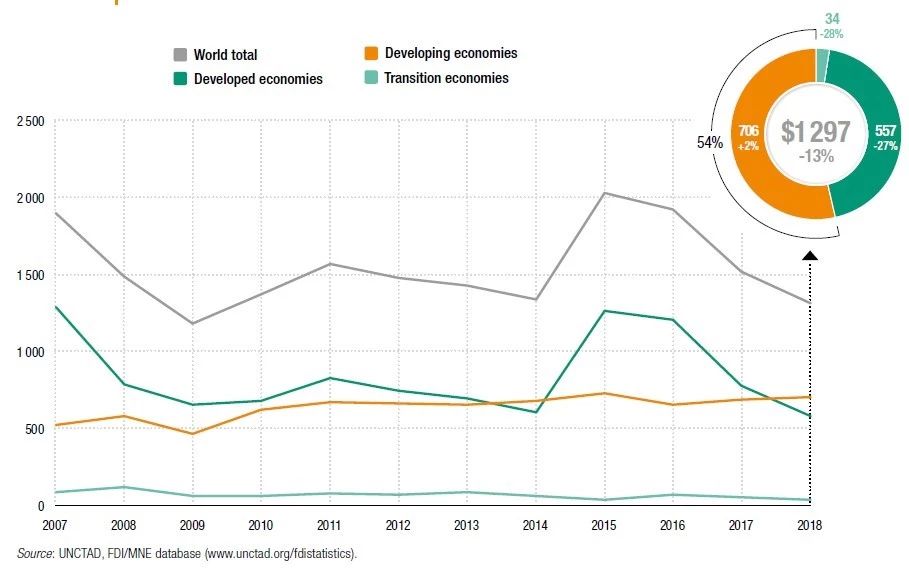 UNCTAD指出,算上2018年,全球外商投资总额已经出现了“三连降”。造成去年FDI下降的主要原因是2017年末美国减税措施导致美国跨国企业在2018年前两个季度大幅撤回海外投资。