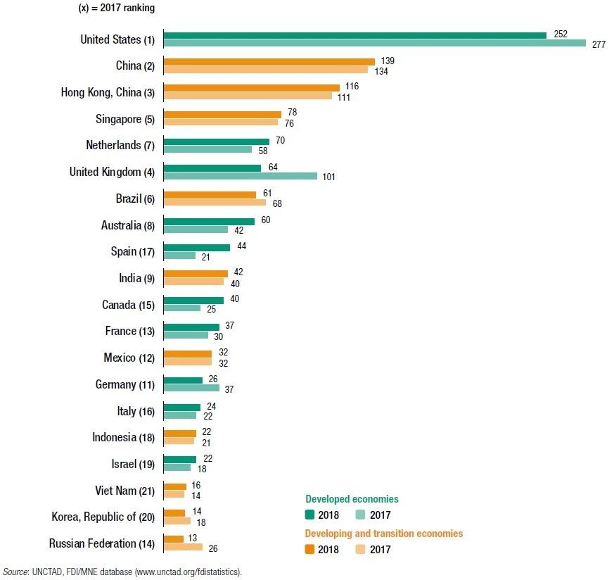 同时在今年FDI流入前二十的国家/地区中,接近半数为发展中国家或者转型中的经济体。