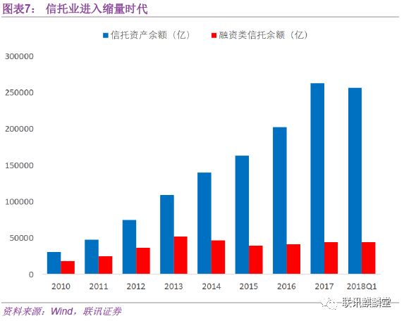 信托贷款指的是资管产品通过信托计划放款。2018年一季度融资类信托产品余额为4.4万亿,占信托业总资产余额的17.3%。