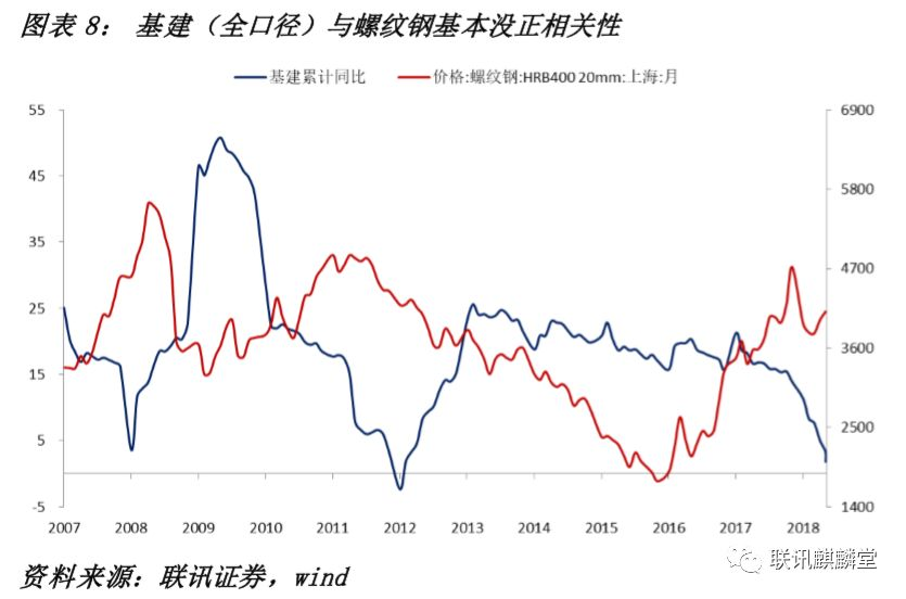 此前基建高增速,螺纹钢价格反向下跌是因为基建投资是逆周期的存在,所以它的高增速往往意味着房地产投资项的低迷,也就是主导黑色商品的需求端萎靡。
