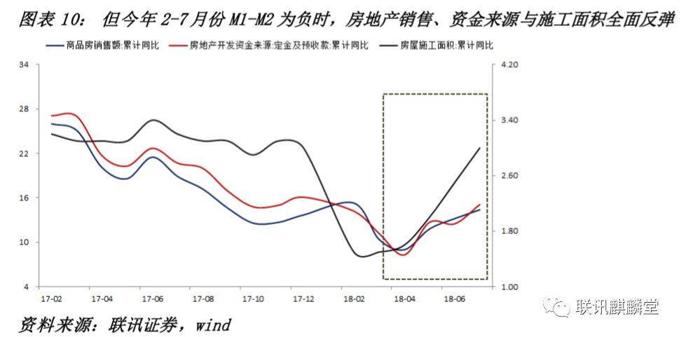 换言之,这一次M1增速的大幅衰减造成的M1-M2为负,可能并不是由房地产销售不佳主导。所以我们也就很难看到房地产开工和施工增速的减弱。