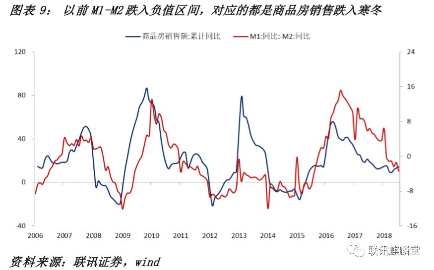 在历史上,每次M1-M2的剪刀差缩窄至负值,往往对应的都是房地产销售的寒冬。这时居民购房意愿很弱,所以居民存款向房地产企业活期存款的转变受阻,从而使M1增速下滑,M2由于居民存款的保持和定期存款的压舱而会相对稳定。