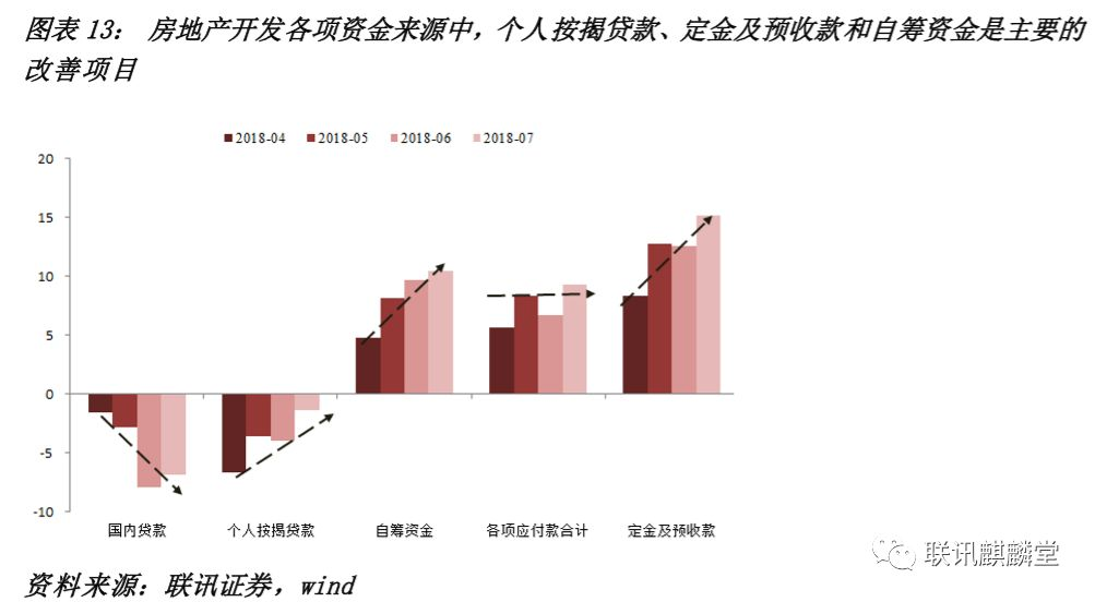 从今年房地产开发资金来源的分项来看,自筹资金、个人按揭贷款和定金及预收款是三个主要的改善分项。