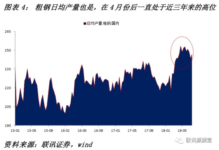 而事实是,钢厂的日均产量在6月前一直维持在比较高的位置,粗钢产量同比增速也一直在上涨(图表3、图表4)。