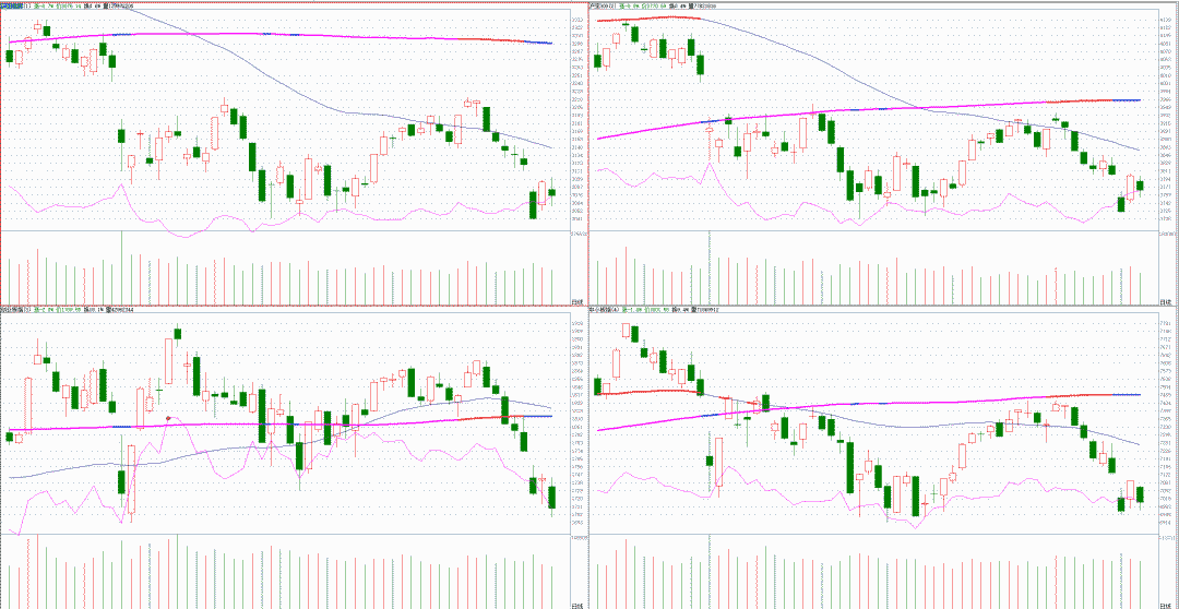 江涛:那我们先看现在大盘处在什么样的状态吧。在市场指数全景图里面,各个指数处在一个什么状态?因为上次节目已经很明显,4个指数没有一个走势强势,但当时还在一个粉红色的可交易状态,是吧?