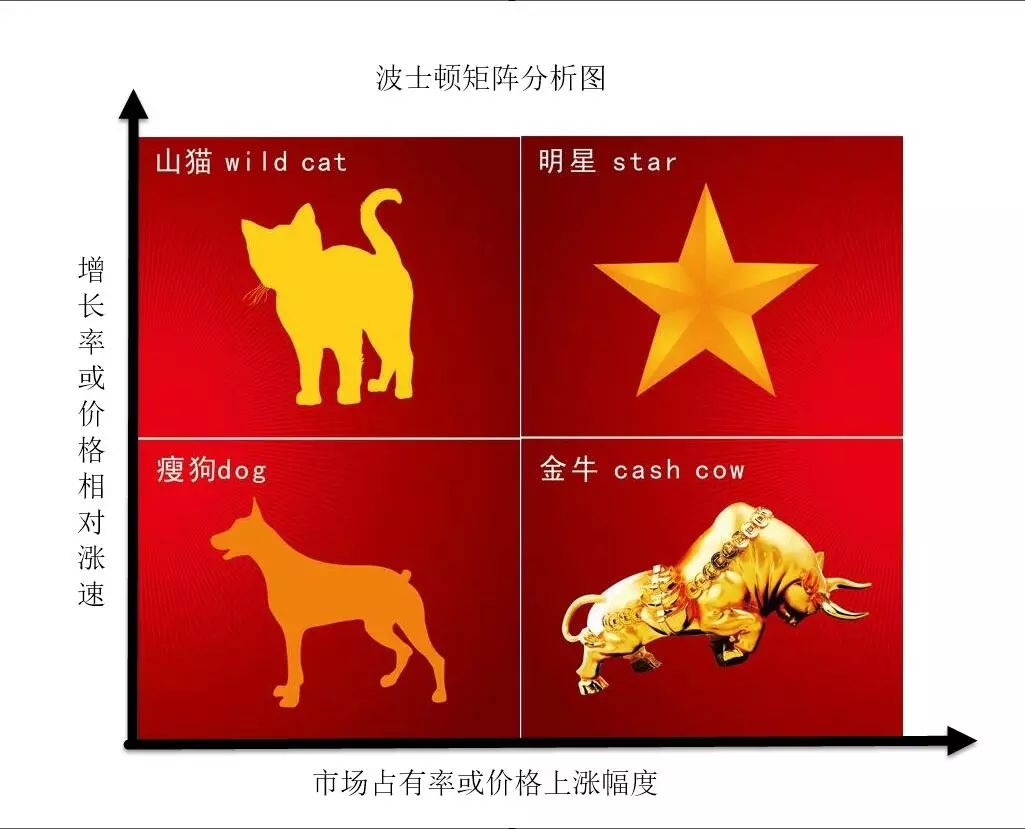 木羊:对。其实波士顿矩阵最初是这样的,它把公司分成这样4类,根据它的市场占有率来做。一类是根据它的成长来看,最好你的收益和市场占有率都在增加,这是最好,叫明星类公司。第二类,就是它的市场占有率很大,但是成长性基本上没有了,这种就叫金牛类公司。第三类,就是市场占有率不是很大,但成长性还不错。市场占有率并不是太好,说明它的产品可能会有问题,但也有可能是新兴公司。对于这类公司,就定义为山猫类公司。最差的一类就是瘦狗类公司,市场占有率比较差,成长性也比较差。