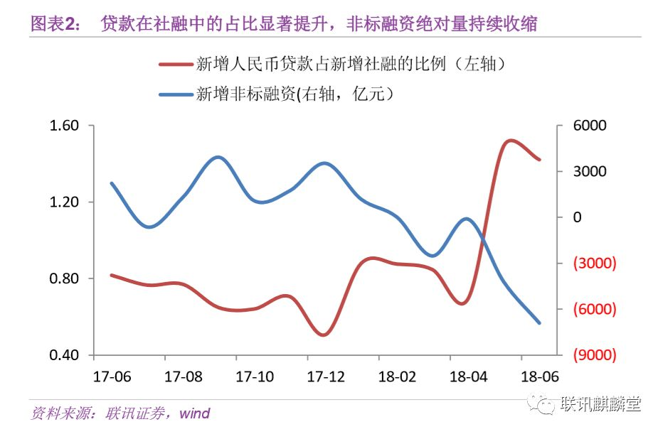 从信用总量看,今年上半年新增社融仅9.1万亿,较去年同期收缩2万亿;从信用结构看,9.1万亿中新增人民币贷款为8.76万亿,占比高达96%,能够承担相对高风险偏好的非标融资(委托贷款+信托贷款+未贴现承兑汇票)收缩了1.2万亿。