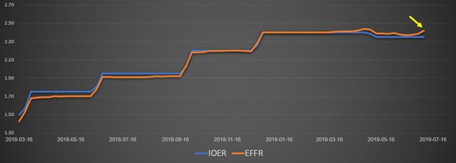 美联储7月8日公布的数据显示,实际利率(EFFR)上周五升至2.42%,比美联储向银行支付的准备金利率(IOER)高出7个基点。