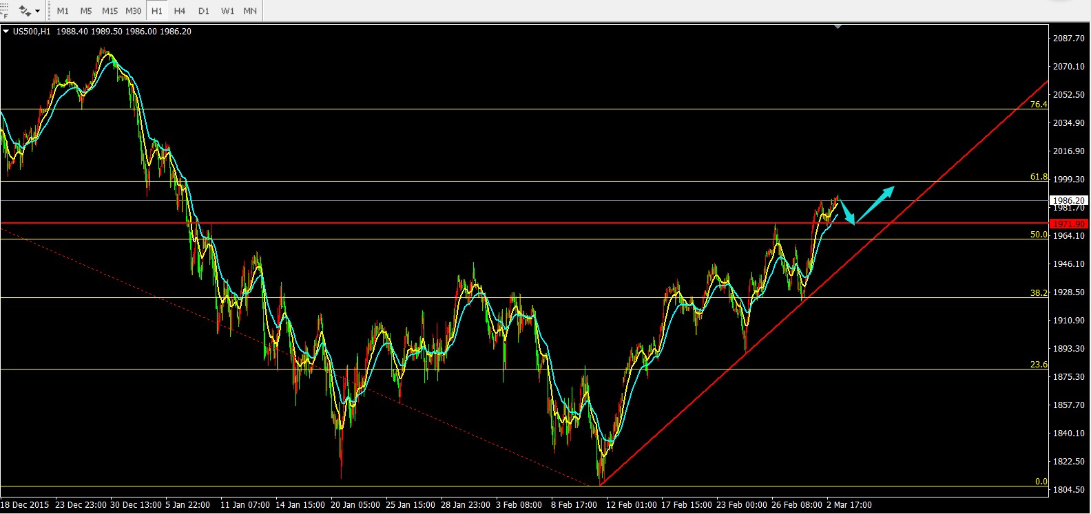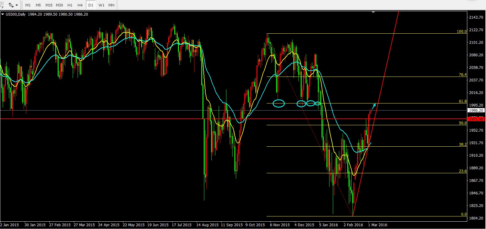 换到日线图上看标普500,标普500期货电子盘向上的目标位时斐波那契61.8%回调位,那里的阻力经过前期多次验证,所以可以预计届时会遇到比较强的阻力。