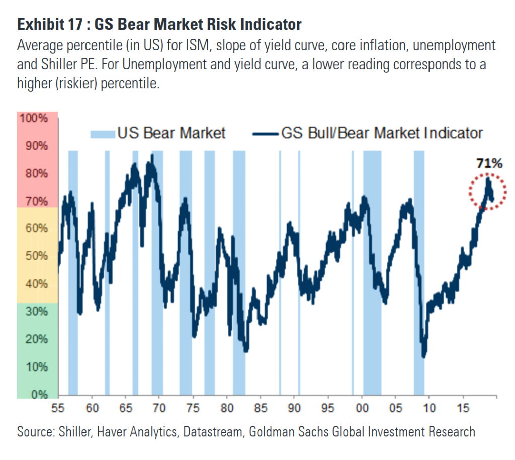 Colombo表示,高盛熊市风险指标自20世纪70年代以来一直处于高位水平,如下图。该指标综合了美国ISM制造业指数、收益率曲线斜率、核心通胀率、失业率及席勒市盈率等指标,并以百分位形式展现。