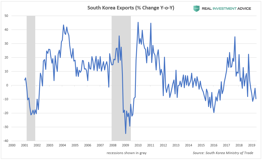 作为全球经济健康状况的衡量指标,韩国出口数据近月持续下跌,如下图所示。Colombo表示,随着全球贸易水平大幅下跌,韩国出口数据的下滑在意料之中。此外,在今年4月,大型家电出货量大幅下滑了17%,而这往往是经济衰退的预警指标。