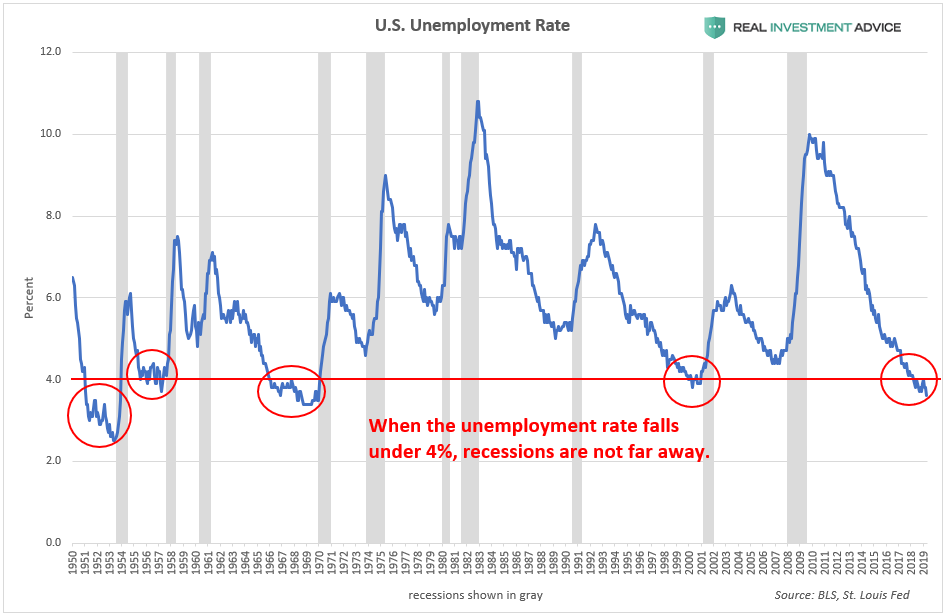 Colombo曾分析指出,当美国失业率水平低于4%时,意味着经济周期已处于相当成熟阶段,同时,经济衰退也就在“不远处”。