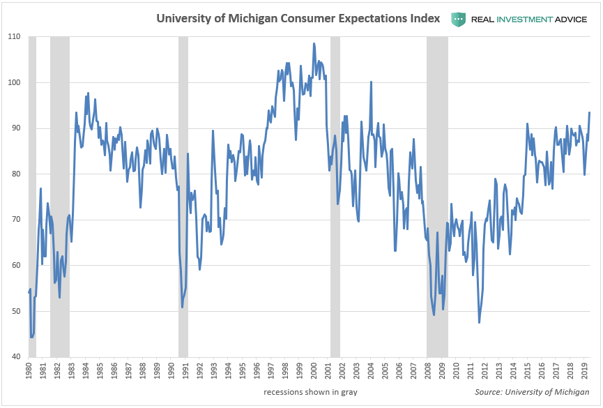 密歇根大学消费者预期指数,作为被用于检测经济衰退风险的主要指标之一,目前未显示经济衰退即将到来的信号——实际上,恰恰相反,该指标仍处于上升趋势。