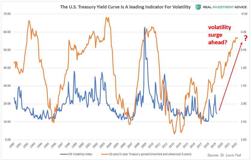 如下图所示,美国10年/2年国债收益率利差所预示出的未来数年波动率的上涨程度,很可能将导致经济衰退以及由于美联储过去宽松政策所引发的巨大资产泡沫的破裂。