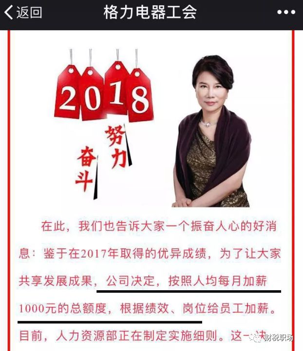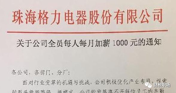 早在2016年底,一则《格力公司全员每人每月加薪1000元的通知》在网上流传:格力电器对入职满三个月的全体员工,每人每月加薪1000元。