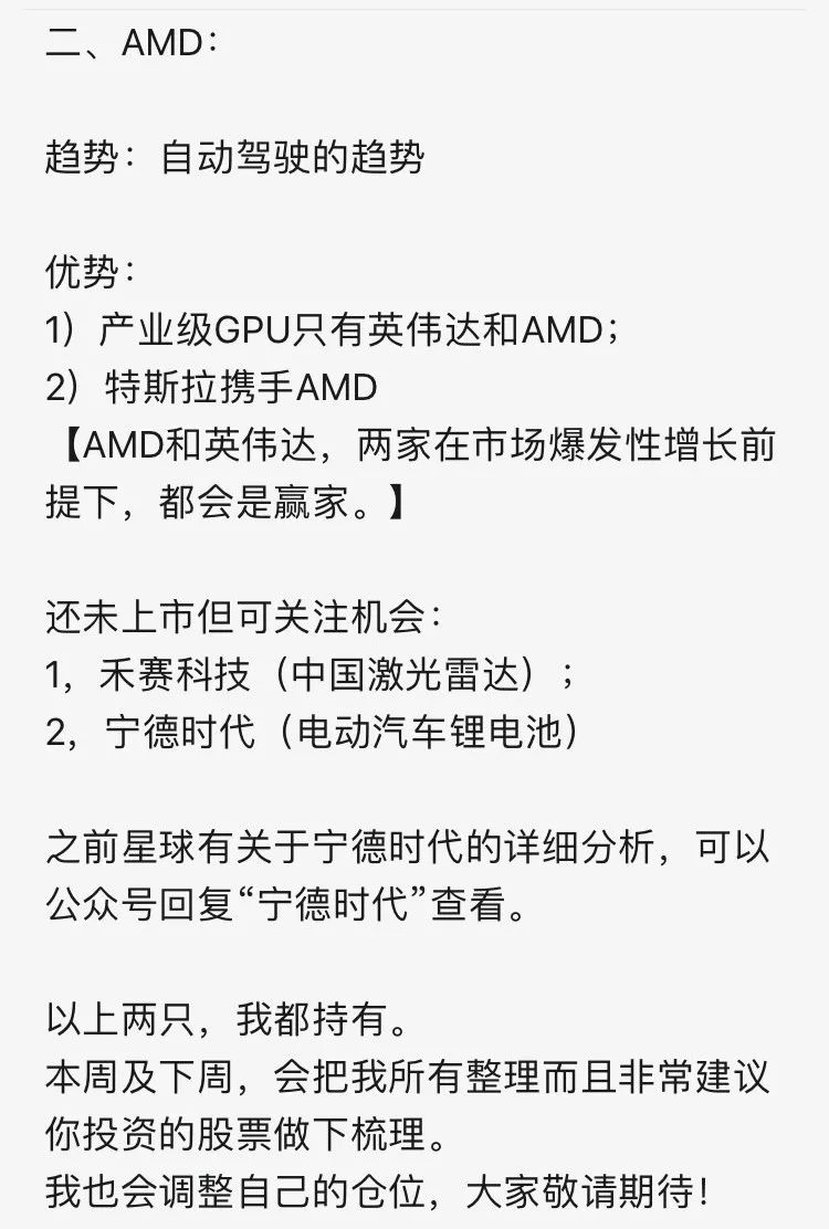 “AMD因为有GPU的能力,所以未来的机会还是更乐观一点。我们一直强调Nvidia和AMD是可以考虑的两只美股。”