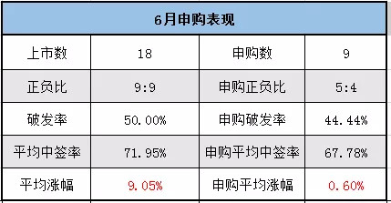 本月18申9,申购率50%,其中5正4负,破发率44.44%,略好于平均表现,平均涨幅只有0.6%,避了坑,同时也避了日照港这样的大黑马。别看申购平均涨幅不大,但是有百分百中签的教育股贡献了不少利润,实际表现挺不错,看下去!