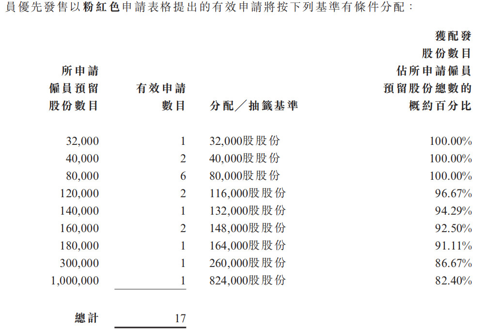 如认购未足额,多余部分将调至公开发售;如员工超额认购,将按照比例配置,下图为嘉涛控股员工申购配比(粉表超购1.11倍):