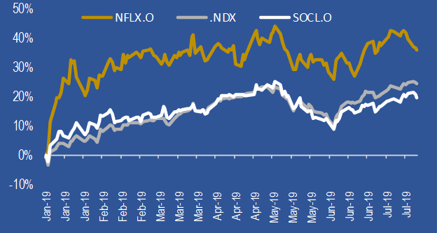- 盛今调低奈飞的三季度预期和2019年全年预期。由于二季度明显放缓的新增会员数量,盛今调低奈飞三季度收入预期至$50.4亿美元,低于盛今先前预期$51.4亿美元,低于华尔街先前预期$52.4亿美元。同时盛今调低三季度全球新增会员至560万,低于盛今先前预期720万. 纵观2019年全年,盛今调低全年销售收入至$193.9亿美元,低于华尔街先前预期202亿美元,相较于盛今先前预期200亿美元。