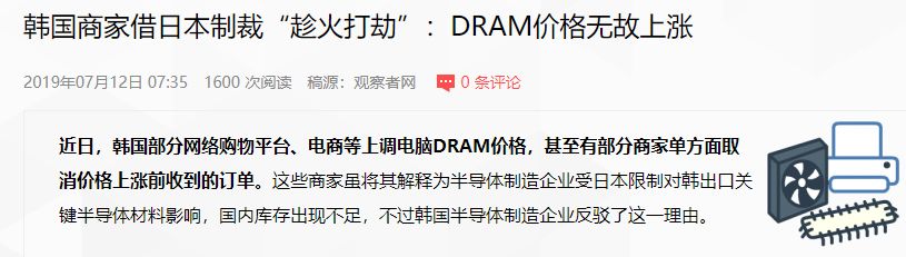 观察者网,《韩国商家借日本制裁“趁火打劫”:DRAM价格无故上涨》